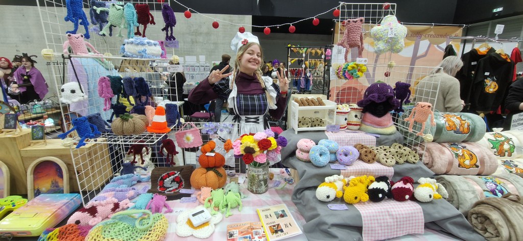 Vicar Emilia : « Il faut la détermination, ça c’est clair. Il faut savoir pourquoi est-ce qu’on rentre là-dedans. Si c’est pour l’argent ou si c’est pour la passion. Les produits ne vont pas être les mêmes, clairement. Si c’est pour la passion, franchement, le plus grand conseil que je peux donner, c’est se trouver un univers. Trouver vraiment une cohérence dans le stand qu’on propose. Et que les gens, ils te reconnaissent dans les conventions. Moi par exemple, un de mes objets phares, c’est les grenouilles et les carpecoilles. Du coup, je sais à chaque fois que si les gens voient des carpecoilles, ils se disent, c’est Vicar Emilia qui fait des carpecoilles. Que des trucs comme ça où quand les gens voient le stand, ils arrivent à reconnaître qui est la personne derrière. C’est un des soucis que je vois en convention ces temps-ci. Enfin, on dirait soucis, je ne voudrais pas dire ça, mais les gens ont tendance à s’égarer dans la quantité de produits qu’ils proposent. Parce qu’ils voient que ça marche chez les autres. Et du coup, ils se disent, ah bah si ça marche chez les autres, je vais le faire aussi. Et du coup, j’ai vu quelques stands où juste, il y a tellement de trucs, tu ne sais pas où donner de la tête. Et même si tu fais beaucoup de choses, donc même si tu t’éloignes du crochet, il faut trouver une ligne directrice. Je pense que c’est ça qui peut faciliter les choses dans le monde de la convention en tout cas. »